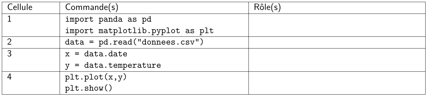 Q14. Compléter les cellules du cahier Python avec les commandes suivantes. Préciser dans le tableau le rôle de chaque ligne.